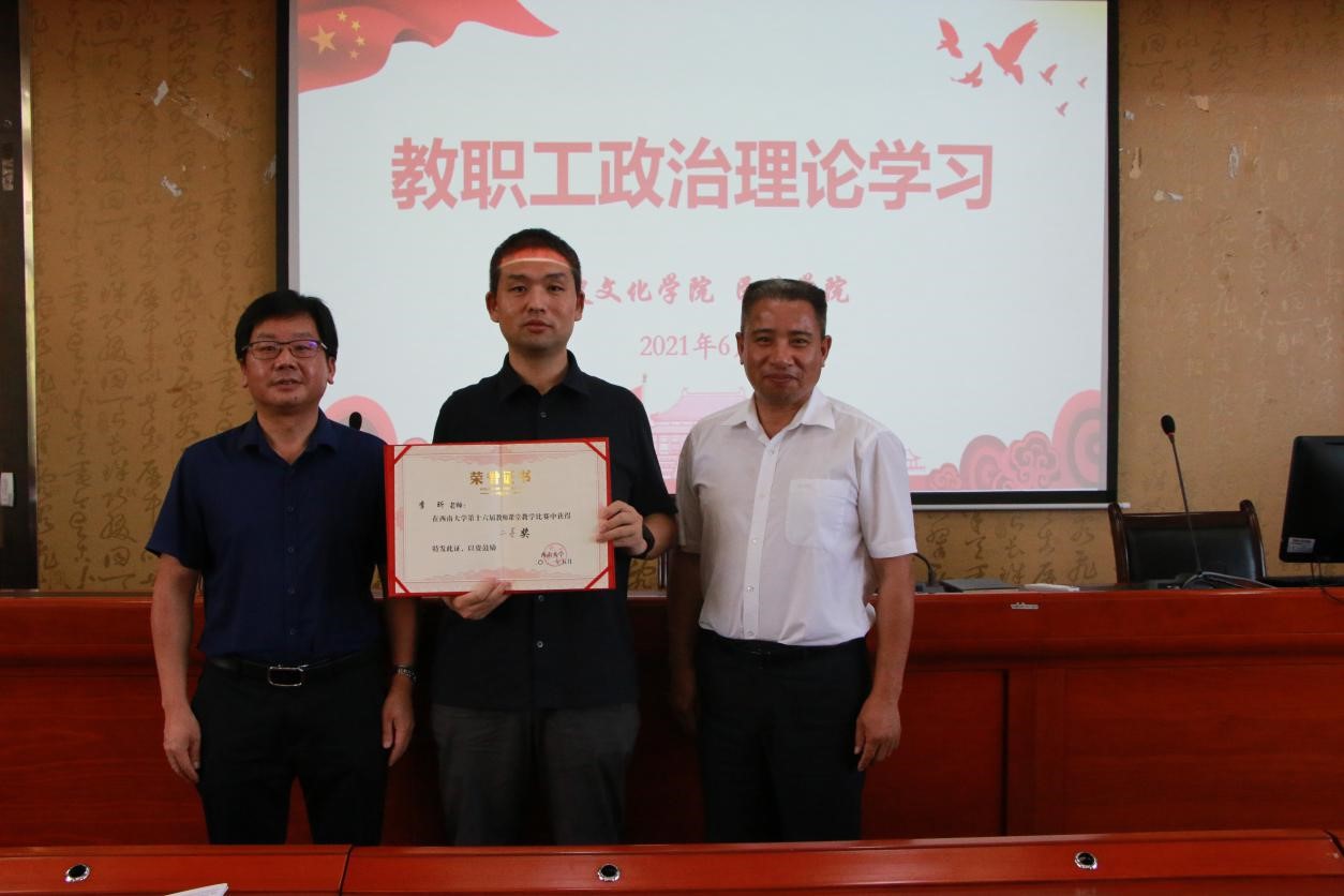 此外,为加强教师队伍建设,提高课堂教学质量,根据学校《关于组织开展第十六届教师课堂教学比赛的通知》的文件,学院于2021年4月19日—4月23日举行了青年教师课堂教学比赛。在此次学习会上,学院对获奖教师进行了表彰,由学院党委书记罗庆昌、学院院长邹芙都和学院党委副书记罗朝斌进行颁奖。李晶同志表示,本次青年教师课堂教学比赛充分展示了学院青年教师优良的教学素养和精神风貌,促进了教学交流,希望老师们继续加强教学技能培训,提高教育教学能力,推动学院教学工作迈上新台阶。