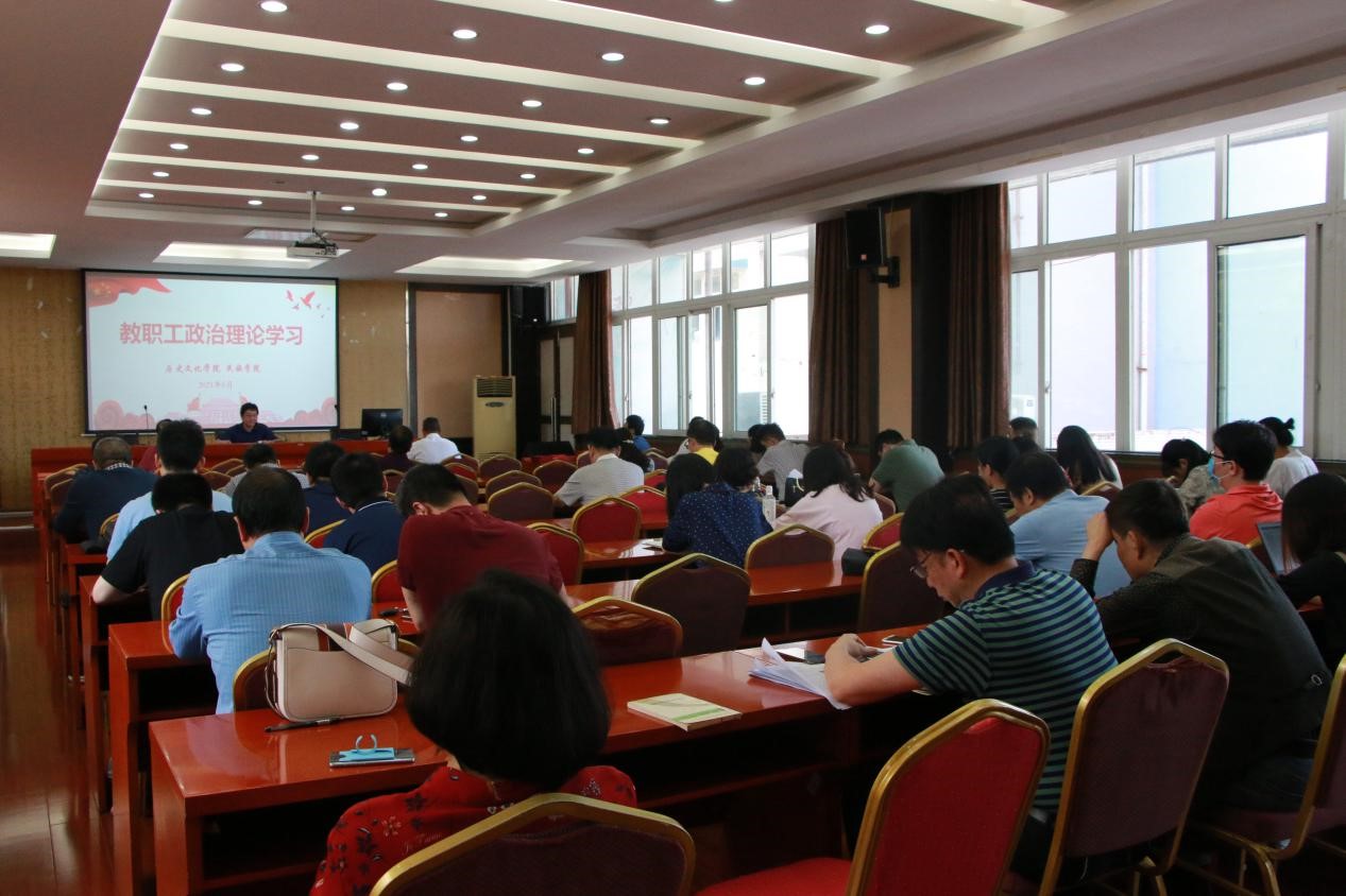 在政治理论学习环节中,学院青年教师蒋朴、马振波、姜帅三位同志就习近平总书记在两院院士大会、中国科协第十次全国代表大会上的重要讲话精神、习近平总书记给《文史哲》编辑部全体编辑人员的重要回信精神和2021年新修订的《中华人民共和国教育法》、《中国共产党普通高等学校基层组织工作条例》等学习内容进行了系统讲解。