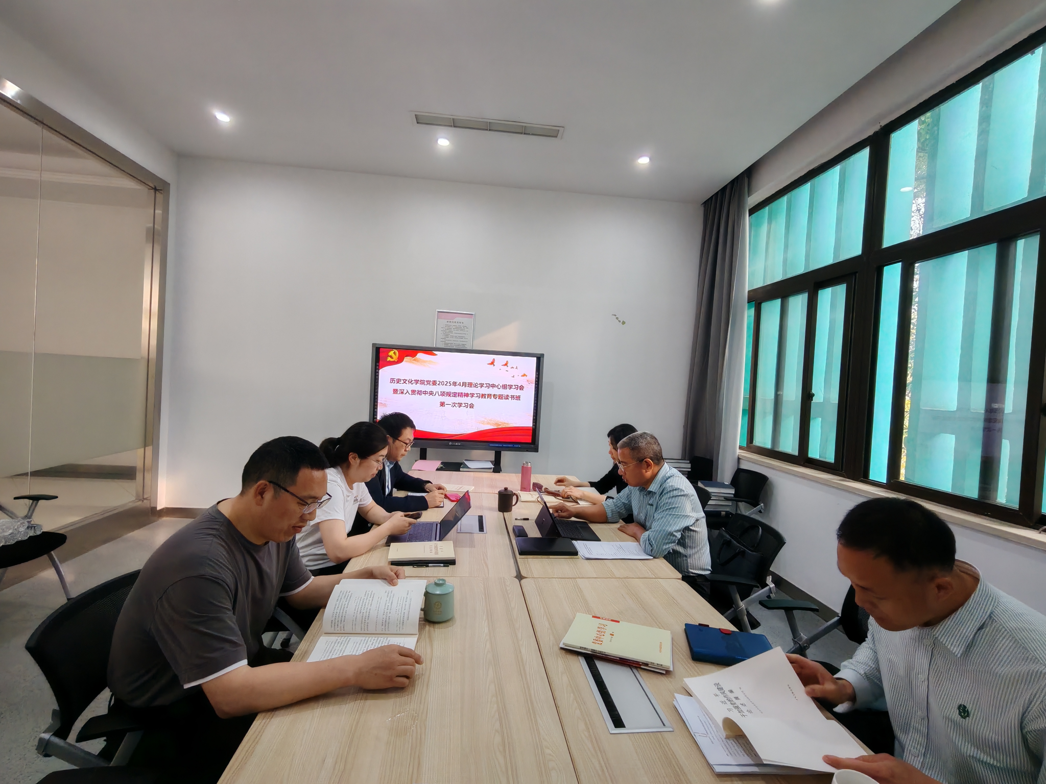 4月11日上午,历史文化学院党委组织召开理论学习中心组学习会暨深入贯彻中央八项规定精神学习教育专题读书班第1次学习会。会议由学院党委书记罗庆昌主持,全体党委委员参加。