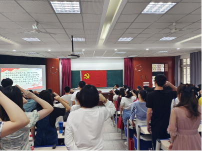 活动首先奏唱《国际歌》,随即学院专职组织员周燕同志致辞并宣读了历史文化学院党委毕业生党员名单以及2022年5月新发展党员名单,表达了对毕业生党员前途的美好祝愿以及对新发展党员同志的热烈欢迎。在庄严的党旗下,由罗庆昌书记领誓,全体党员进行入党宣誓。