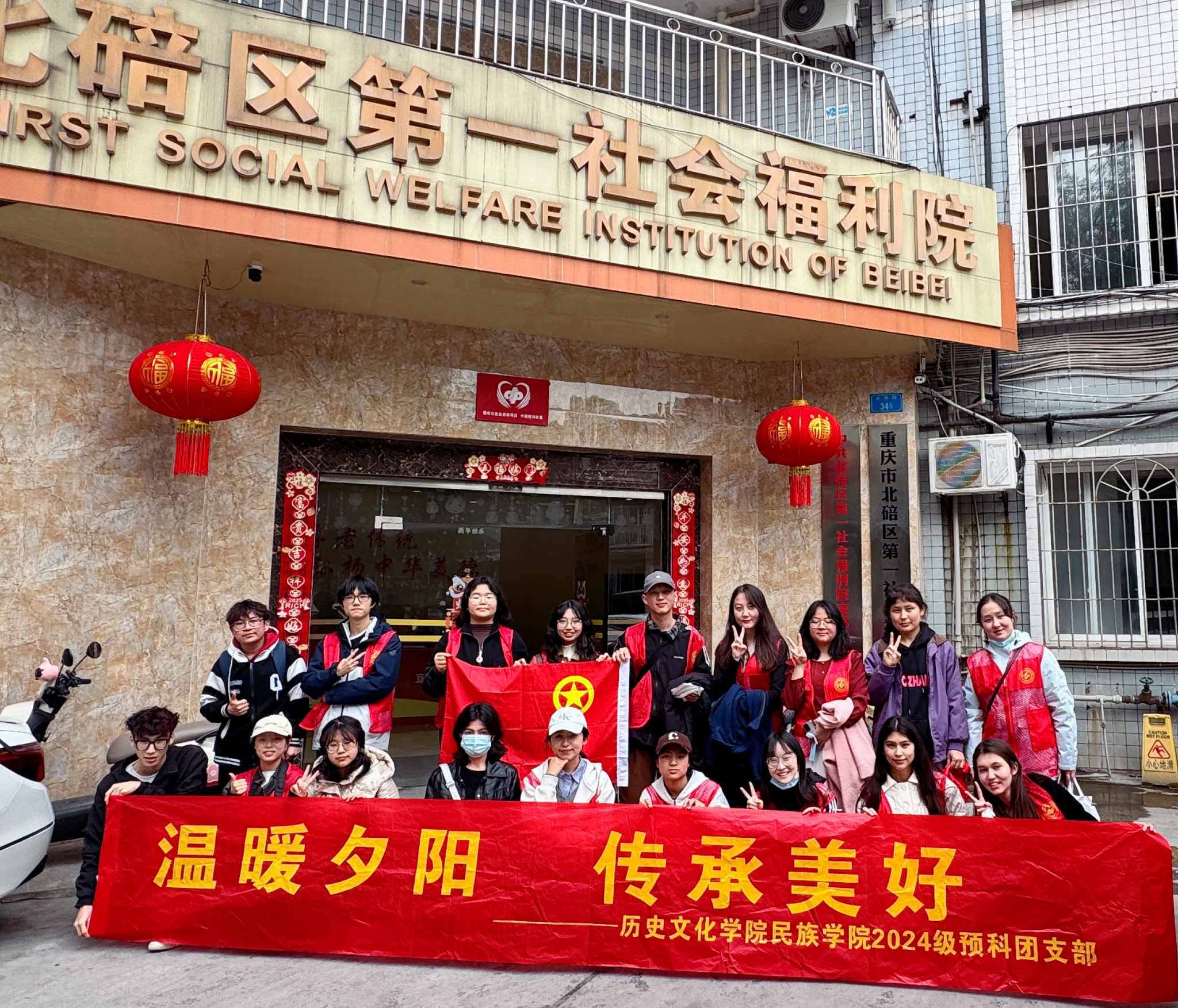 2025年3月21日下午,365英国上市集团历史文化学院 民族学院预科一班团支部走进重庆市北碚区第一社会福利院,开展以“温暖夕阳,传承美好”为主题的敬老爱老志愿服务活动。活动通过文艺表演、健康互动、手工制作等形式,为老人们送去春日的温暖与关怀,架起代际交流的桥梁。