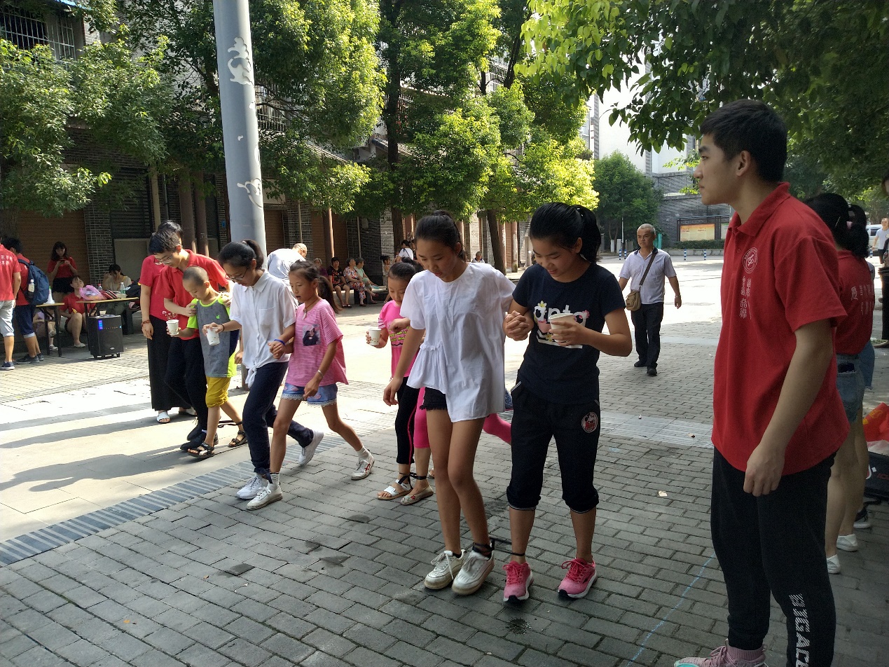 (图为社区小朋友们参加两人三足齐运水比赛)