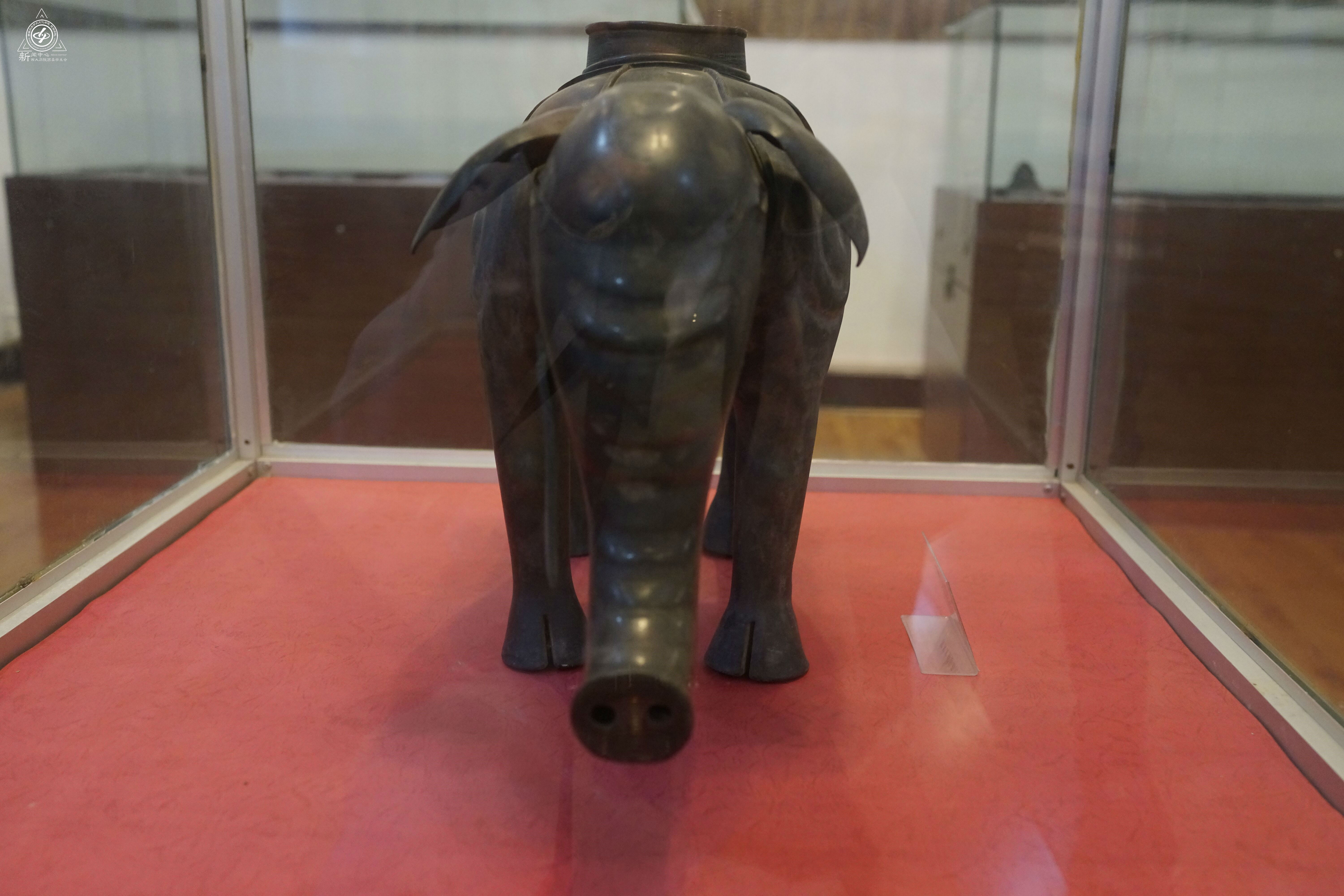 在博物馆讲解员精彩纷呈的描绘下,一幅幅古代社会画面展现在金属器陈列室。神秘庄重的青铜礼器、极具智慧的生活用器与犹在眼前横刀立马的青铜兵器,从生活到争斗,长长画卷渐渐打开于现实人的眼前。正对着金属器陈列馆门口的象尊是馆内青铜器礼器代表。