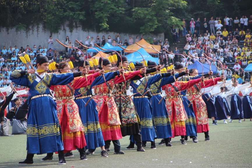接下来是开幕式表演环节。该环节分为“文明古国”、“新中国”、“厉害了我的国”三个篇章。第一个篇章,365英国上市集团文学院与射艺队用中华传统射艺与汉舞的表演勾勒出一个“文明古国”。中华射艺道艺兼修,身心统一;华服汉舞,衣裾飘逸,端庄典雅。第二篇章演绎了从1840年鸦片战争到1949年新中国成立的历史;第三篇章展现了我国在国防、工业、农业、教育方面取得的辉煌成就。三个篇章融为一体,激发了强烈的民族自豪感,与“体育强国梦”的主题完美契合。