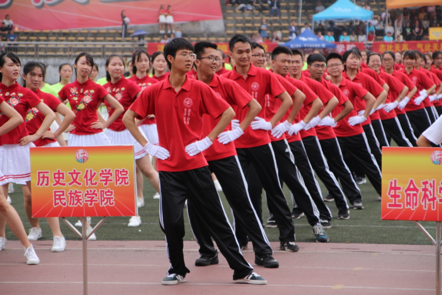4月19日上午8时许,运动会开幕式在第二运动场准时开始。首先,由包括历史文化学院民族学院在内的全校30多个学院(部)、西塔学院等单位组成的方阵依次进入会场。历史文化学院民族学院的学生身着民族服饰,向看台及主席台挥手示意并保持微笑,一张张年轻的面庞,散发着青春朝气,写满了斗志昂扬。