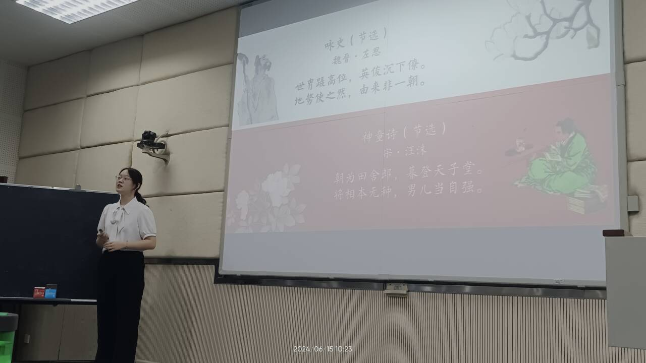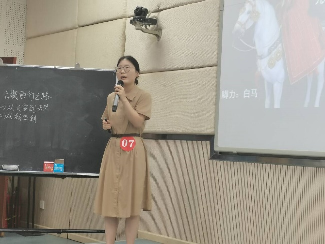 现场比赛中,陶艳琳以“大国之路——唐朝的中外文化交流”为题,以玄奘西行为典型案例,从交流互鉴之路、兼收并蓄之路、继往开来之路三个方面,讲出了唐朝文化的向心力、传播力、学习力,最后落脚到文明交流互鉴上的价值与意义上;黄自然在“隋唐选官制度之新:科举制的创立”中,以人才选举为主线,讲授科举制的时代背景、创立过程与深远影响,并结合诗歌、戏曲、文物等进行跨学科融合教学。