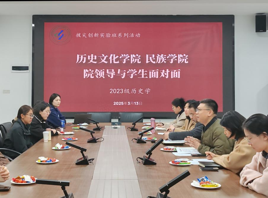 为搭建师生交流平台,进一步了解非师范学生成长发展方面的需求和问题,2025年3月13日上午,历史文化学院 民族学院在同心楼207会议室举办"院领导与学生面对面"座谈会。学院党委书记罗庆昌、党委副书记张静、副院长陈永亮、教务办主任蒋朴以及2023级辅导员高倩与历史学拔尖创新实验班学生深入交流,共话人才培养与学业发展。