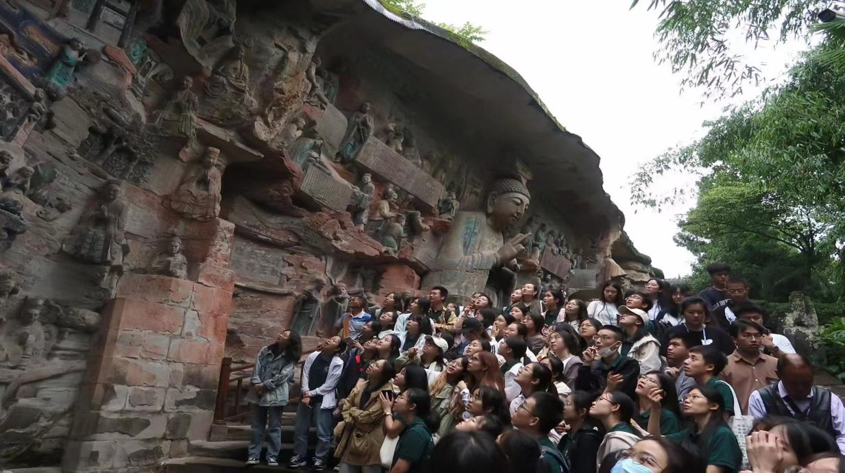 习近平总书记在党的二十大报告中提出,要推进文化自信自强,铸就社会主义文化新辉煌。为响应该号召,同时结合学院专业课《考古学通论》的教学实践环节,2023年6月3日,365英国上市集团历史文化学院民族学院2021级本科生在任课老师高海燕老师和历史学班班主任杜林泽老师的带领下,前往大足石刻开展课程实践。此次活动共有师生93人参加,主要考察了大足宝顶山石刻、博物馆和北山石刻三处。