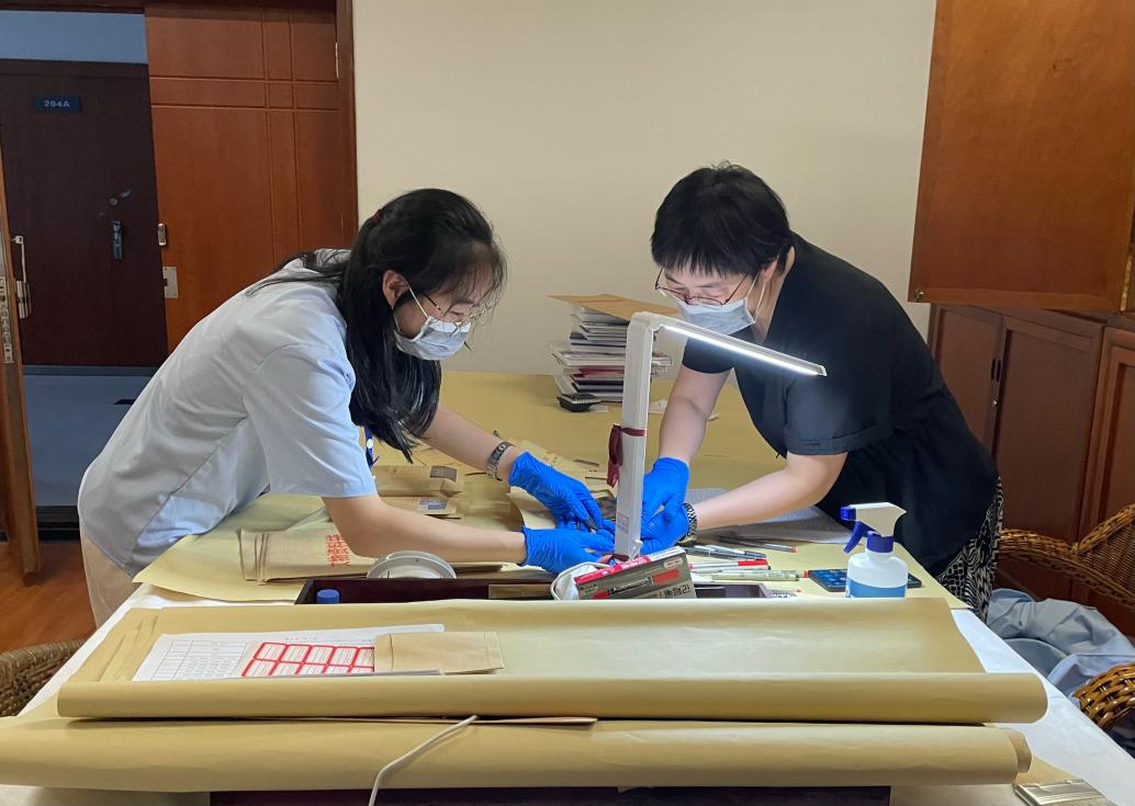 图1 王林杰同学协助史春月老师进行文物整理