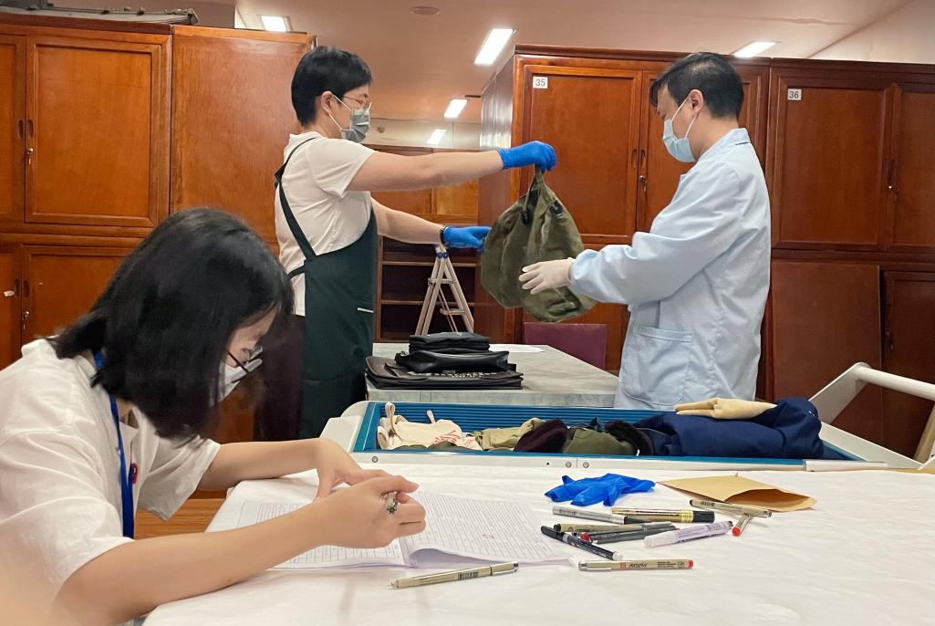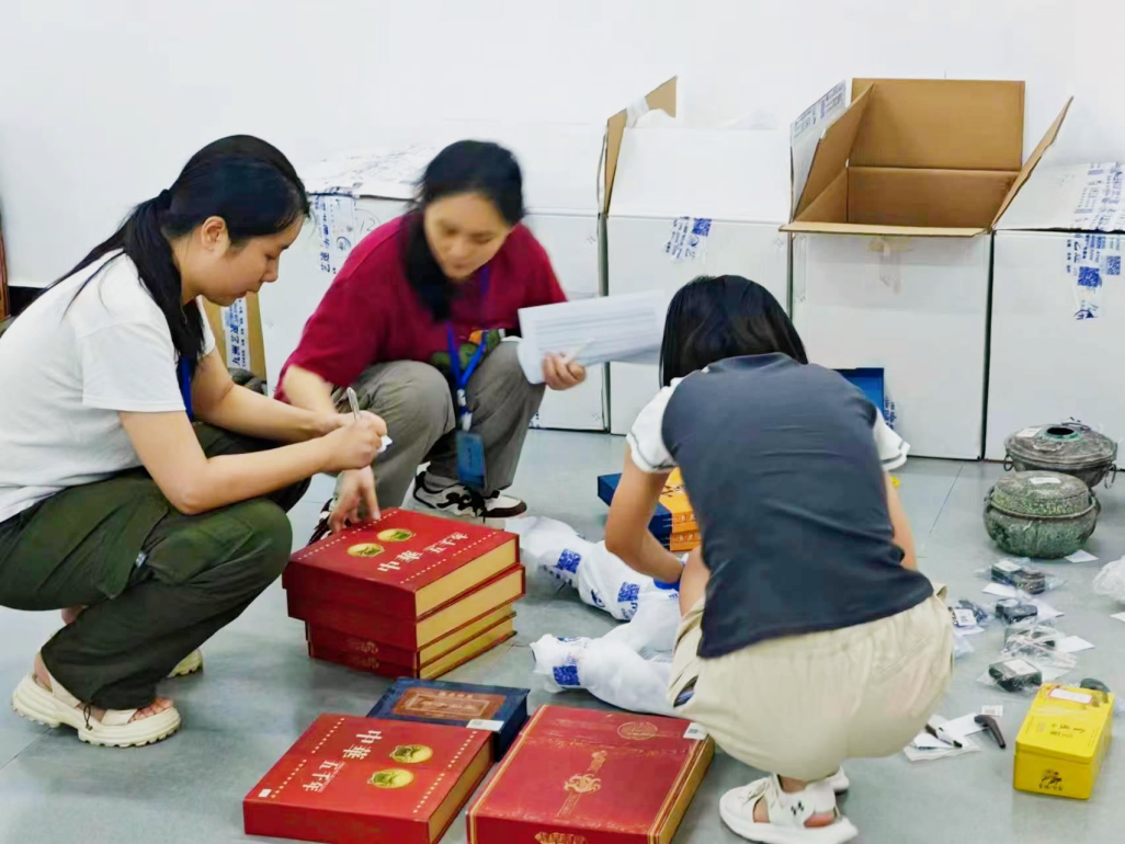 图2 王毓伟同学协助史春月、郑犁老师完成文物交接工作