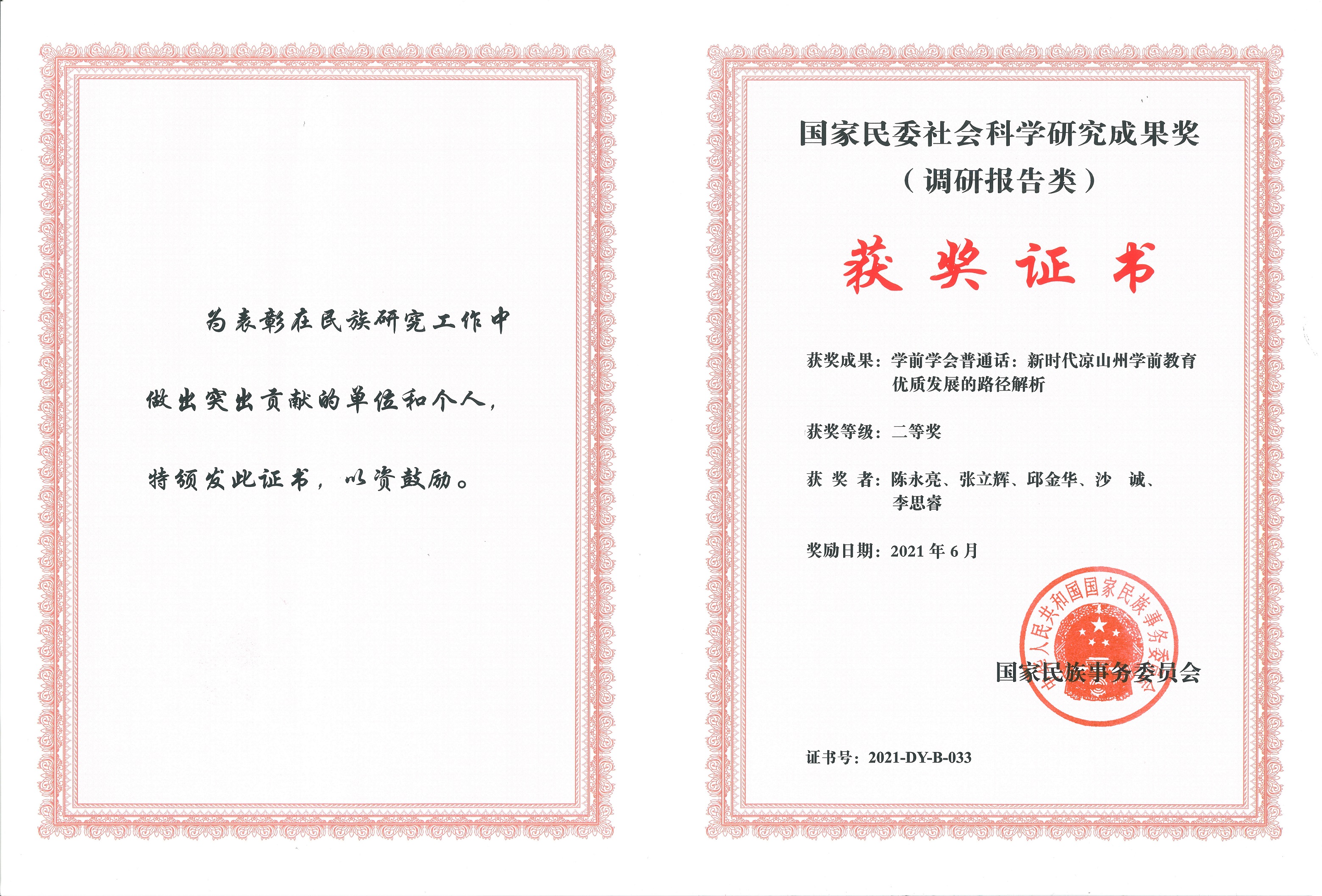 近日,2020年度国家民委社会科学优秀成果评选结果揭晓,我院教师陈永亮等撰写完成的《学前学会普通话:新时代凉山州学前教育优质发展的路径解析》,荣获国家民委社会科学研究成果奖(调研报告类)二等奖,展示出我校在民族研究领域的优势。