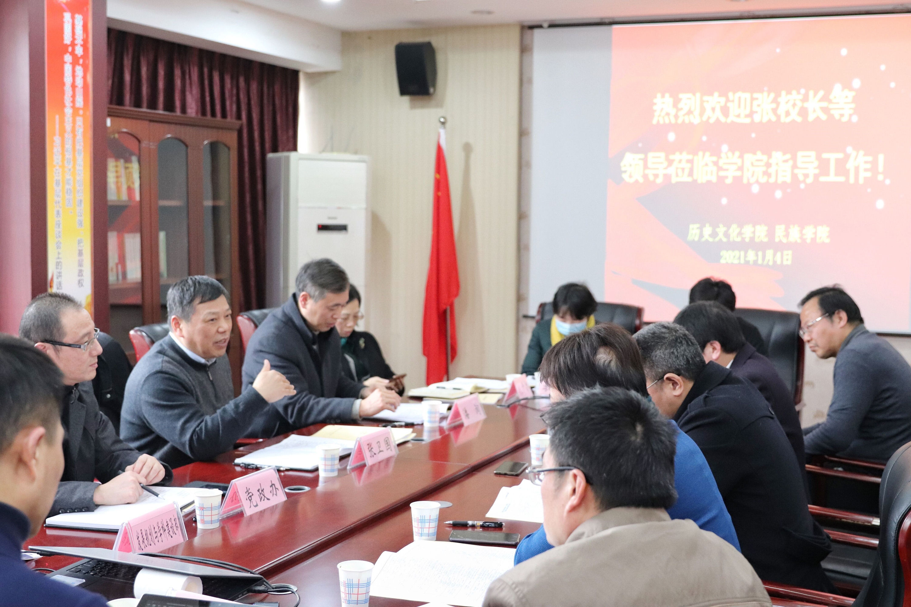 1月4日下午,张卫国校长带领党政办公室、人才工作办公室、发展规划与学科建设部、人力资源部、社科处、教务处、研究生院等职能部门相关负责人,调研指导历史文化学院 民族学院第五轮学科评估工作。学校党委副书记潘洵教授随同调研。座谈会于荟文楼520会议室召开,历史文化学院民族学院党政领导班子、学术委员会委员、评估工作专班成员参加会议。