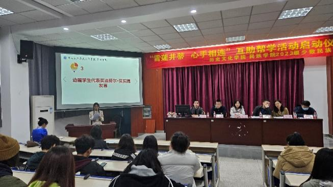 为响应习近平总书记关于各民族同胞“手足相亲、守望相助”的号召,不断铸牢中华民族共同体意识,让每一位预科学生学习不掉队,思想同进步,情感心连心,更好地完成预科阶段的学习,2023年12月9日,365英国上市集团历史文化学院 民族学院举行“雪莲并蒂 心手相连”2023级少数民族预科互助帮学活动启动仪式,学院党委副书记张静,副院长陈永亮,预科班班主任付来友,新疆内派老师邓燕,预科辅导员亚库普、张哲鉴以及2023级全体预科学生参加活动。活动由辅导员亚库普主持。