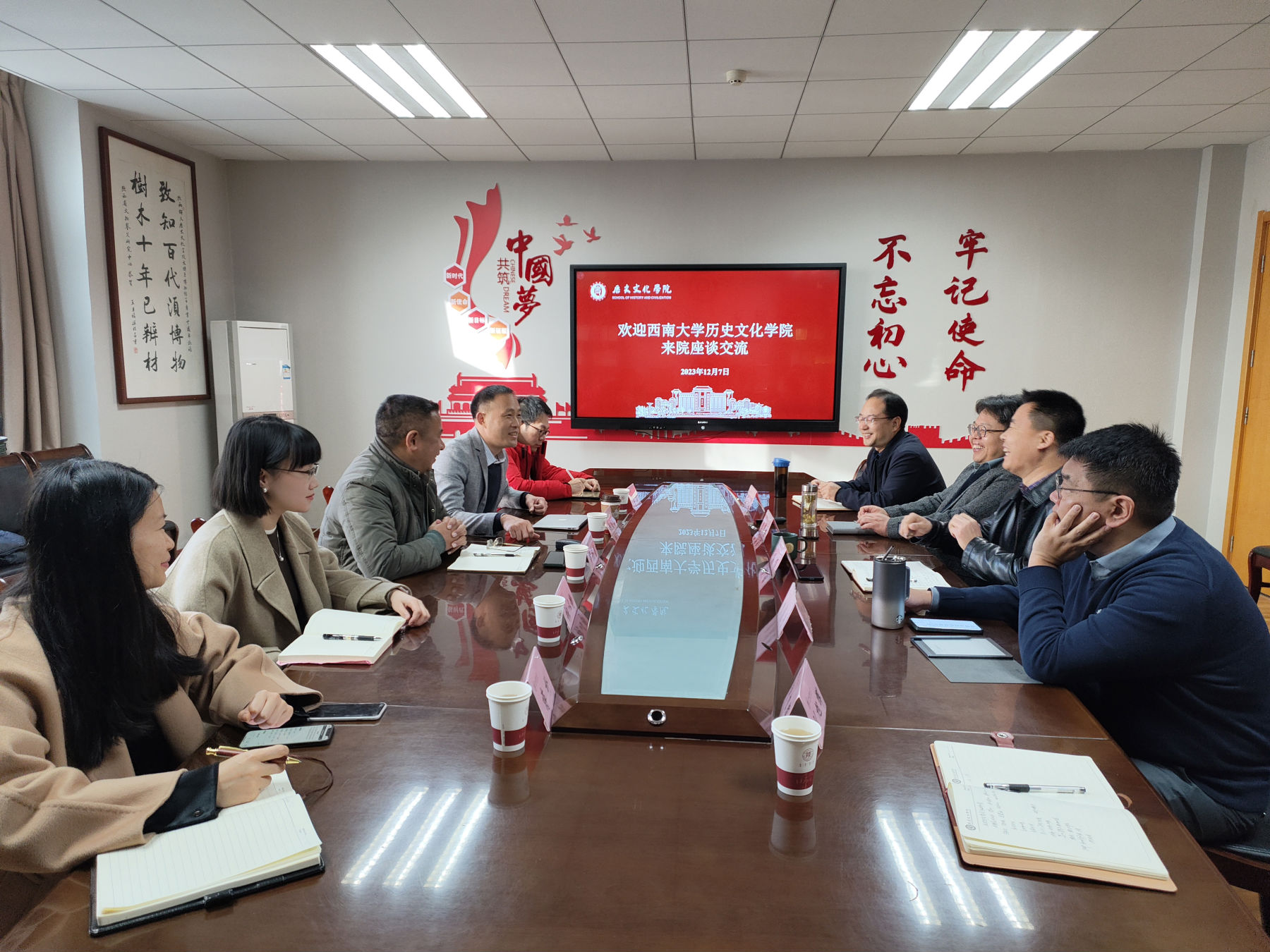 为促进学院事业高质量发展,提升学科建设水平,12月7日,学院党委书记罗庆昌、院长赵国壮、副院长李晶、教学办主任蒋朴、科研助理张以静前往陕西师范大学历史文化学院开展学科调研。陕西师范大学历史文化学院党委书记孙伟、院长李秉忠,副院长郭响宏、副院长李晨子参加座谈,并对学院一行到访表示欢迎。
