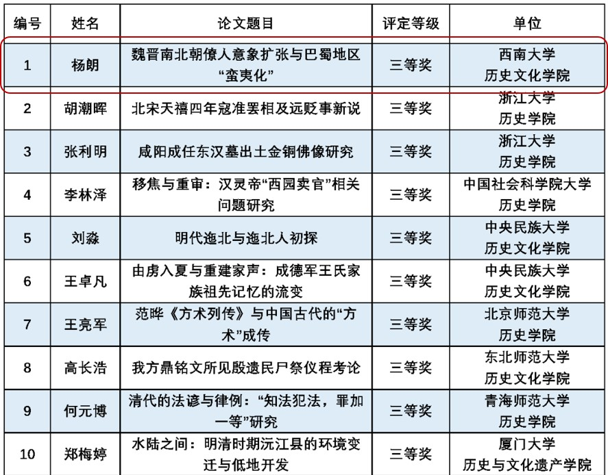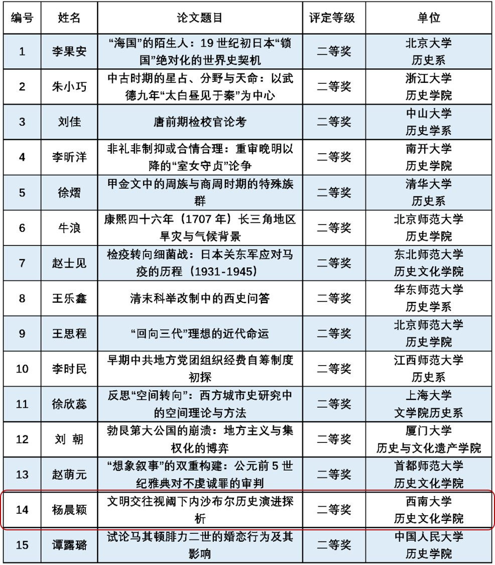 本次大赛由北京师范大学历史学院主办,由学科专家组成的评奖委员会组织实施,教育部社会科学委员会历史学学部提供学术指导。此次竞赛共收到28个学校推荐参赛论文115篇,经专家组严格匿名评审,共评出一等奖5名,二等奖15名,三等奖28名。