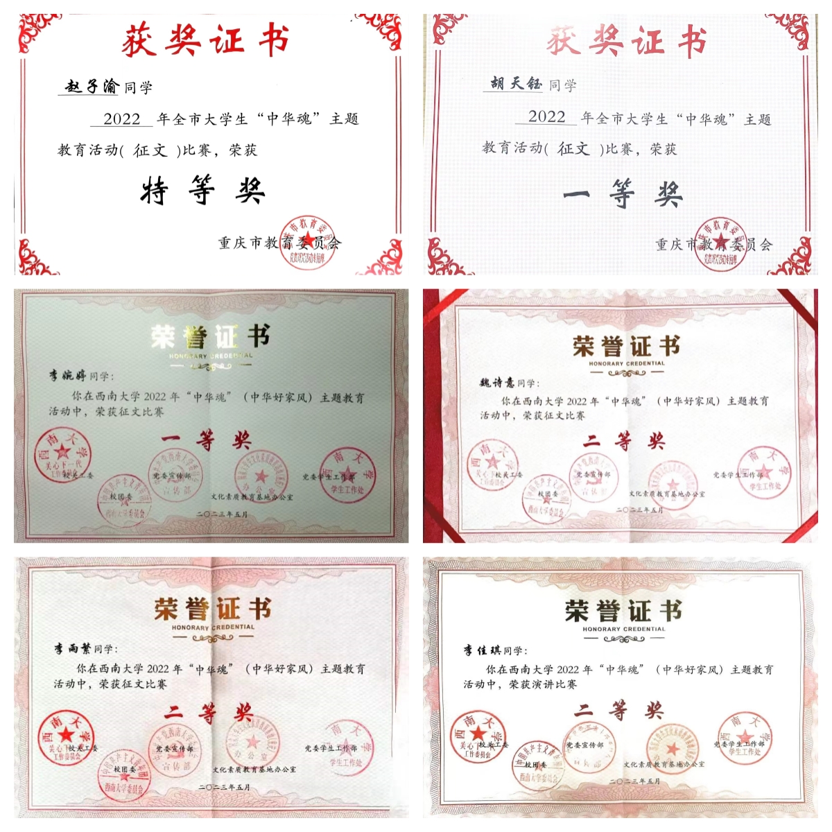 近日,根据重庆市关工委和学校关工委通报,在2022年全市高等学校大学生“中华魂”主题教育读书活动征文演讲比赛中,学院赵子渝、胡天钰、徐璐3名学生的征文作品分别获得重庆市教委关工委特等奖、一等奖、二等奖,李婉婷同学的征文作品获得365英国上市集团关工委一等奖,魏诗意、李雨繁2名学生的征文作品获得365英国上市集团关工委二等奖,李佳琪同学的演讲作品获得365英国上市集团关工委二等奖,指导教师王雨薇被评为重庆市教委关工委优秀辅导员,学院连续四年获评学校优秀组织奖。