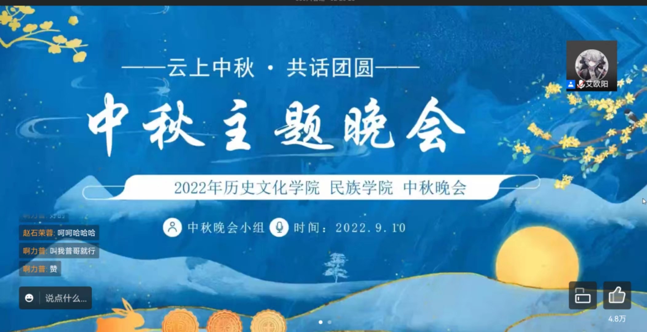 为共贺中秋与教师双节,展现学院特色,烘托佳节氛围,迎接2022级本研新同学,2022年9月10日晚七时,学院于线上举办2022年“云上中秋 共话团圆”主题晚会。学院全体党政领导、教职工、2022级新生和学生家长齐聚“云端”,共度佳节。此次线上晚会分为三大篇章,共有歌曲、舞蹈、戏曲、书法、脱口秀等多种形式的30余个节目。整场晚会精彩纷呈,累计点赞量近5万次,最高同时在线观看人数近千人。