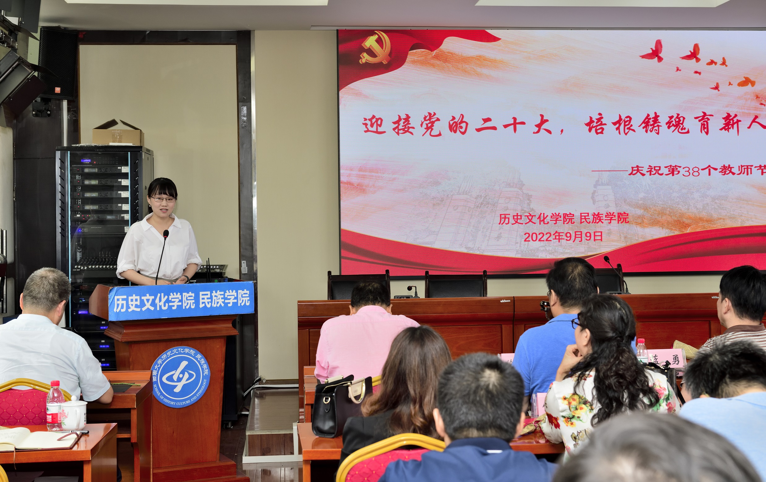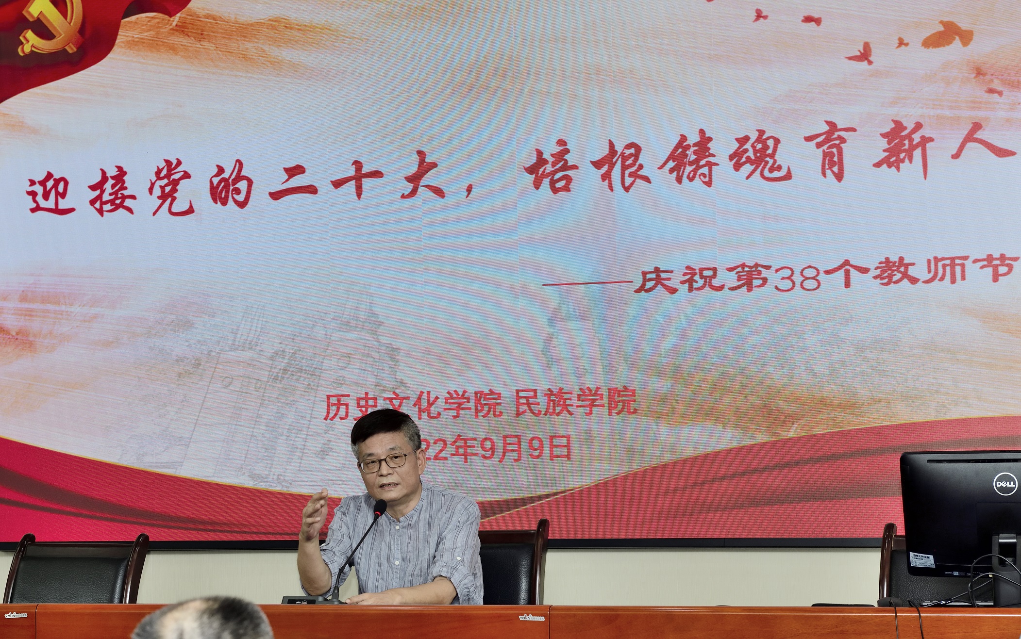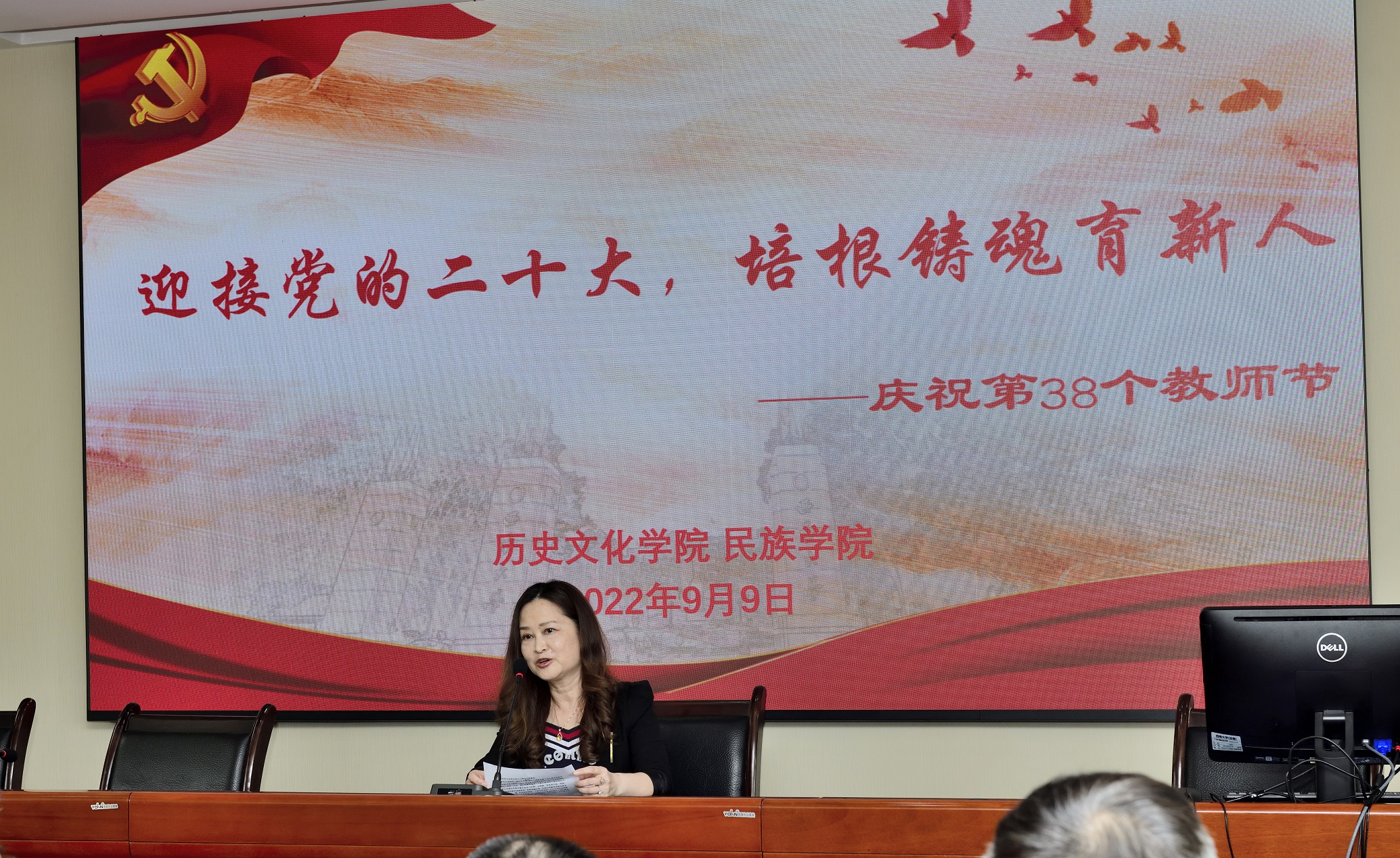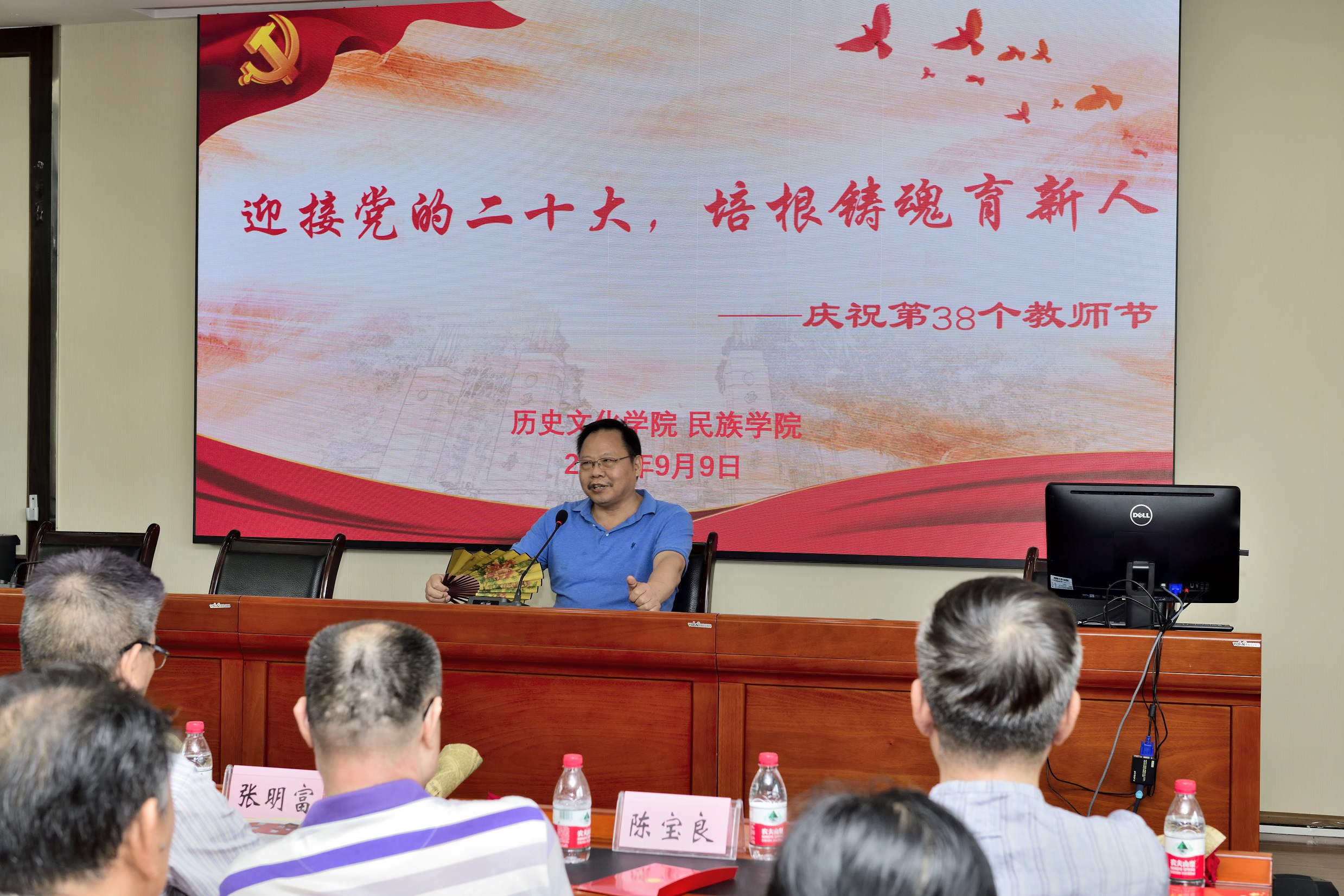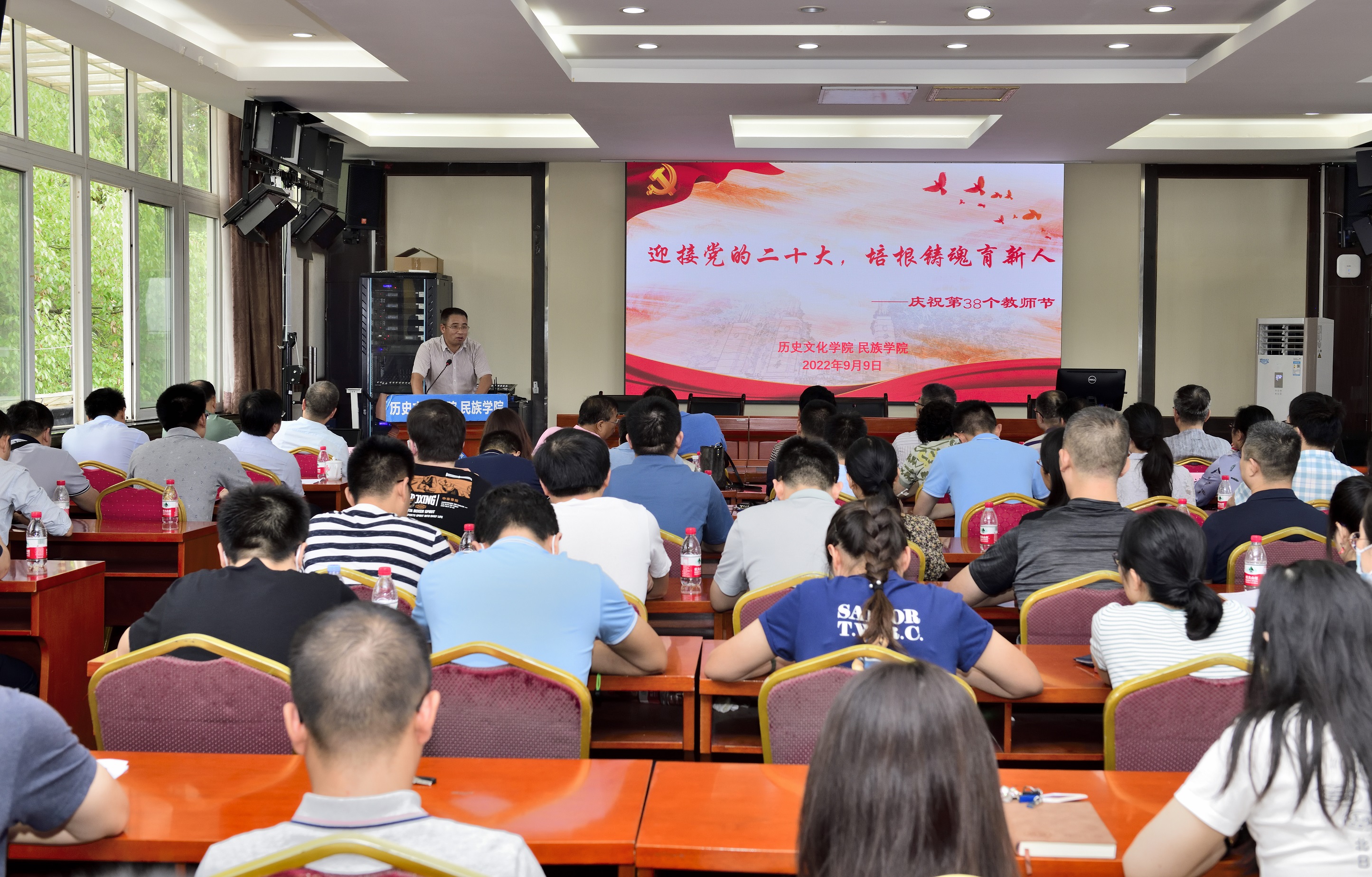 为百年伟业进学修德,行会通能,立超胜志,砥砺深耕,履践致远,含弘光大史学文脉,西南特立,我俦功名不负华夏;守三尺讲台木铎金声,汇天地心,藏桃李情,弦歌不辍,树蕙滋兰,继往开来民族精神,天下学行,烛中薪火长有人间。9月9日,在第38个教师节来临之际,历史文化学院 民族学院教师节庆祝大会在学院七楼报告厅隆重举行。学院党政领导班子,全体教职工参加活动。庆祝仪式由院党委书记罗庆昌主持。