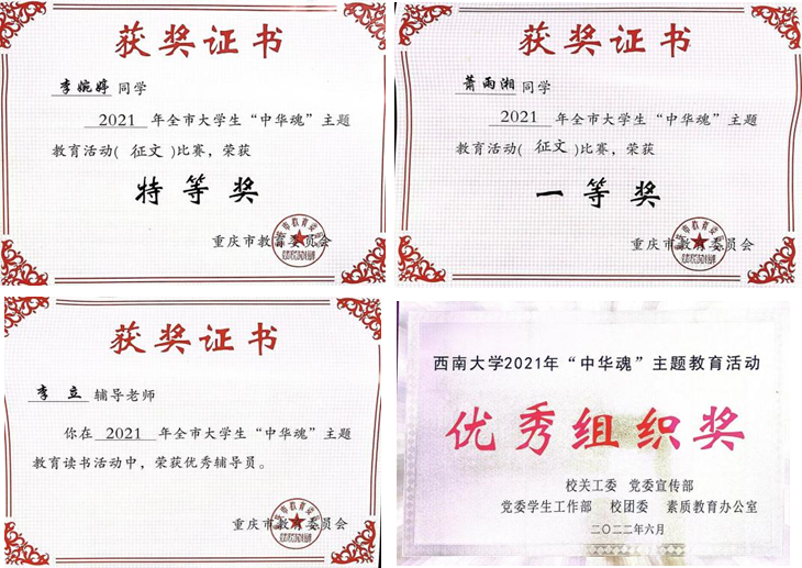 近日,根据重庆市关工委和学校关工委通报,在2021年全市高等学校大学生“中华魂”主题教育读书活动征文演讲比赛中,学院李婉婷和萧雨湘2名学生的征文作品分获重庆市特等奖和一等奖,指导教师李立被评为重庆市优秀辅导员,学院连续三年获评学校优秀组织奖。