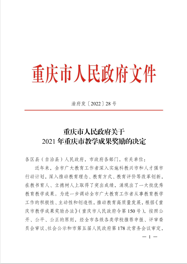 本成果荣获重庆市教学成果二等奖,是重庆市政府及重庆市教育委员会对我院本科教育教学改革创新成效的充分肯定。学院将以此为契机,进一步做好教学成果的应用推广工作,催生出更多具有标志性、高水平的研究成果,不断推进学院高质量本科教育发展。