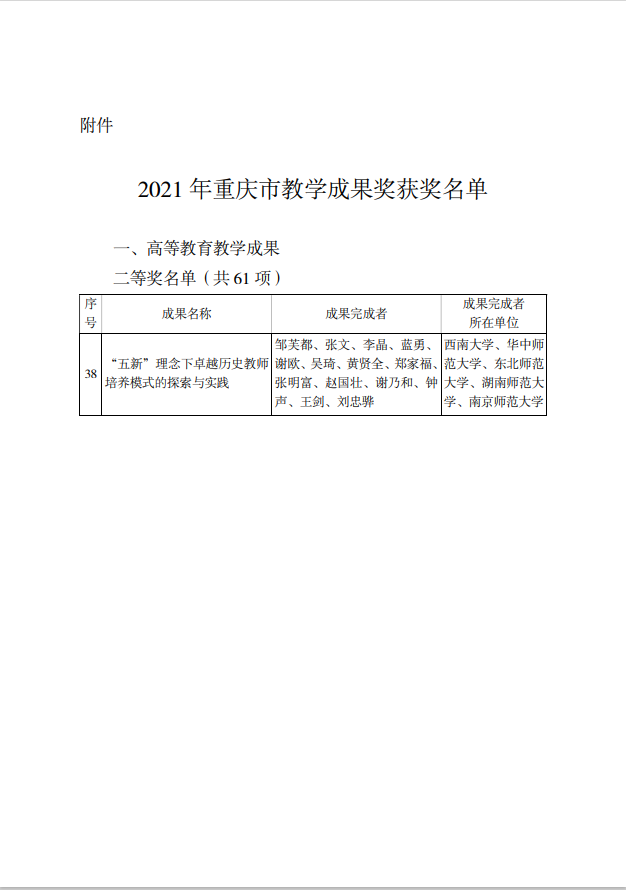 近日,重庆市人民政府公布了《关于2021年重庆市教学成果奖励的决定》(渝府发〔2022〕28号)。由我院牵头并协同4所双一流师范院校历史学国家一流本科专业建设点共同申报的《“五新”理念下卓越历史教师培养模式的探索与实践》荣获2021年重庆市教学成果奖高等教育教学成果类二等奖。