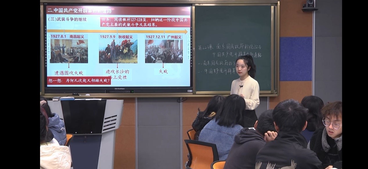 为庆祝建党100周年,展现学院本科生党史教育成果,任颖、王越两位同学在本次大赛中,分别将参赛的授课内容选定为《中外历史纲要》(上)第21课《五四运动与中国共产党的诞生》和第22课《南京国民政府的统治和中国共产党开辟革命新道路》。她们在四位导师的悉心指导下,深入挖掘课程内涵,巧妙设计教学环节,整个授课过程引人入胜,彰显出历史教育铸魂育人、固本培元的作用,获得评委专家一致好评。两位同学取得的成绩,充分展现了学院“五新”理念下卓越历史教师培养模式取得的成效,促进了学院与国内兄弟院系的交流与互动,为下一阶段学院卓越历史教师培养提供了重要参照。