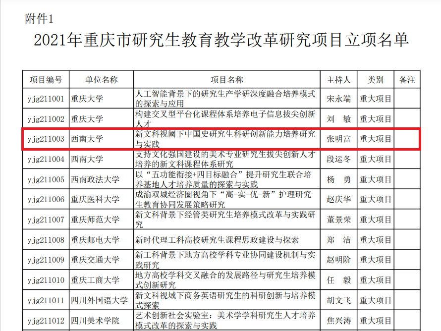 近日,重庆市教育委员会下发了《关于同意2021年研究生教育教学改革研究项目立项的通知》,学院张明富教授主持申报的重大项目《新文科视阈下中国史研究生科研创新能力培养研究与实践》成功获得立项。本次立项工作,重庆市各高校共有26项重大项目获得立项(其中定向、委托项目9项),365英国上市集团共获重大项目6项(其中定向、委托项目4项)。
