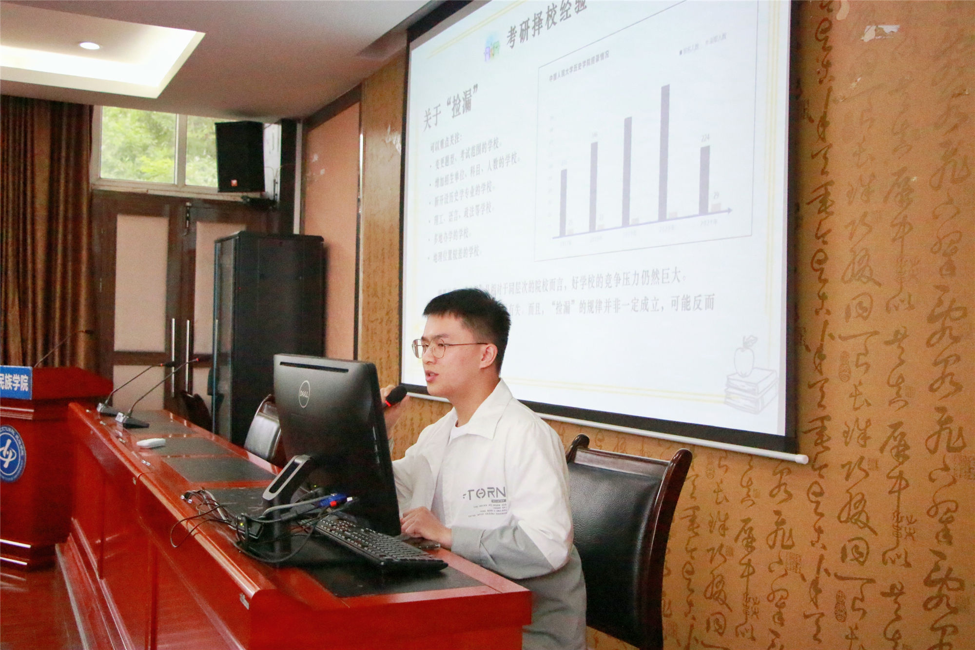 随后,朱磊和叶章强两位同学分享了历史学考研的相关经验。两位同学分别被中国人民大学和武汉大学录取,并为在座同学就考研择校、专业选择、初试复习、复试准备、面试表现等问题进行了全面的讲解。一方面,他们列举了大量翔实的图文数据,向同学们直观地反映出近年来历史学的考研形势;另一方面,他们还结合历年初复试真题,以例为证,具体地分析了考研题型。