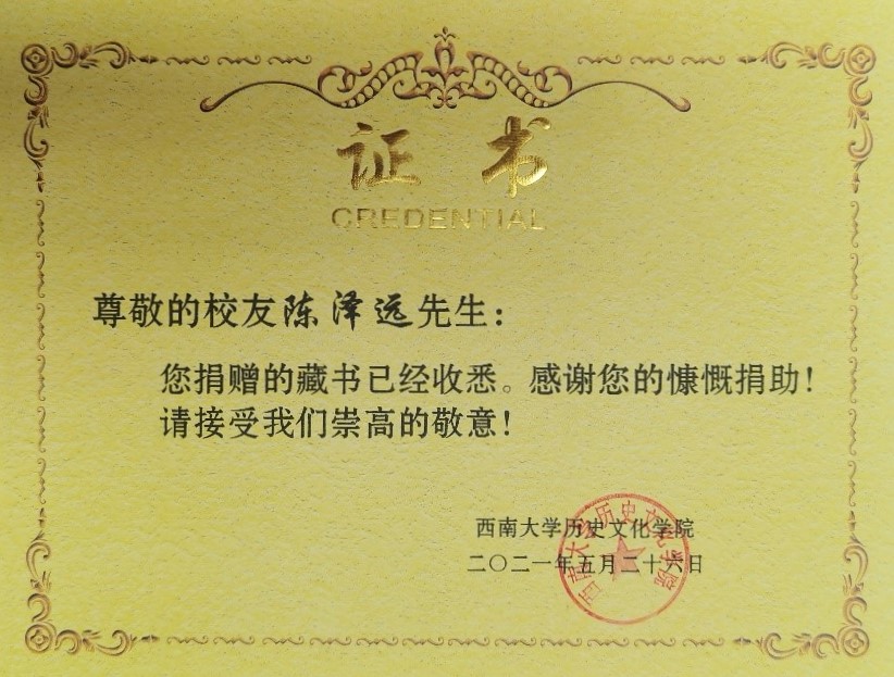 近日,我院1960届校友陈泽远先生情系母院,关心学院发展,向我院资料室捐赠图书一套。陈泽远先生的赠书开拓了同学们的视野,丰富了大家的精神生活,充裕了资料室藏书资源,为学院的发展添砖加瓦。
