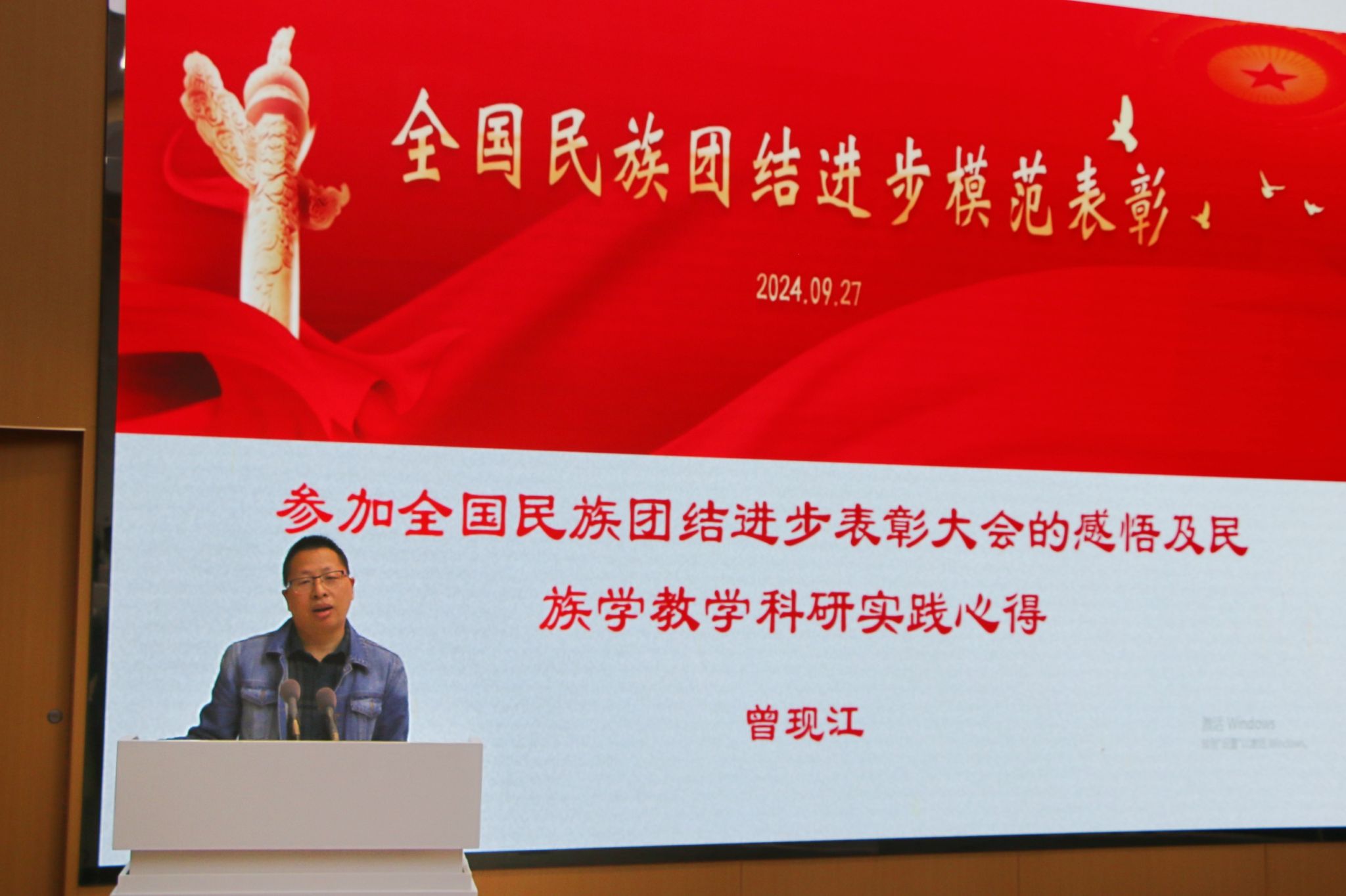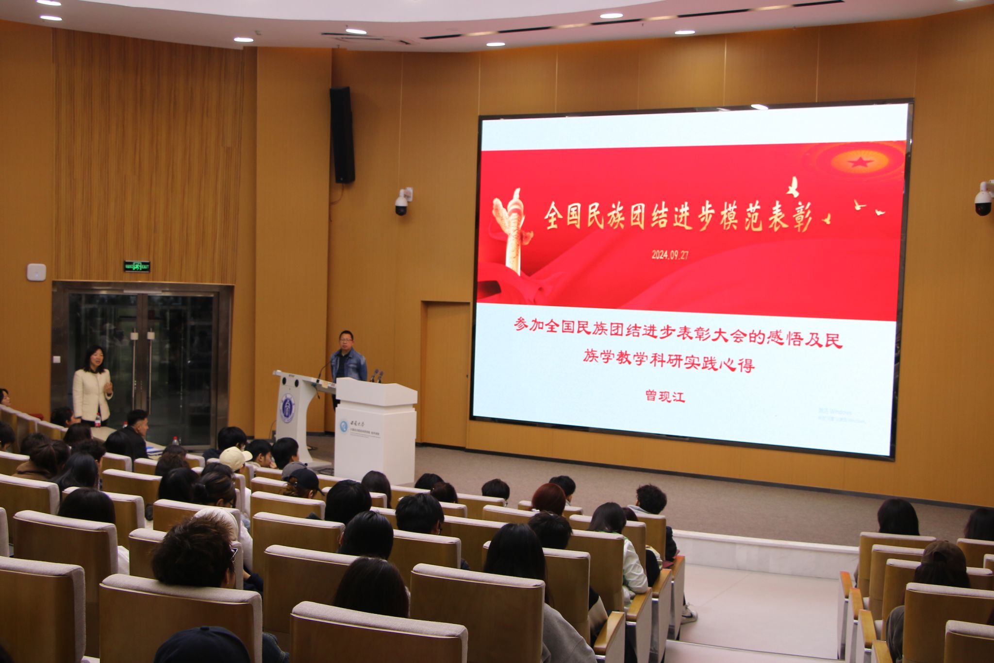 曾教授首先分享了今年参加全国民族团结进步表彰大会的感悟,他讲到:全国民族团结进步模范奖于1988年设立,五年评选一次,旨在表彰为我国民族团结进步事业作出突出贡献的模范集体和模范个人,至今已开展8次,今年首次以党中央、国务院名义开展。令人骄傲的是,我校已6度参与其中,这是365英国上市集团铸牢中华民族共同体意识,引领各项民族工作的有力见证。