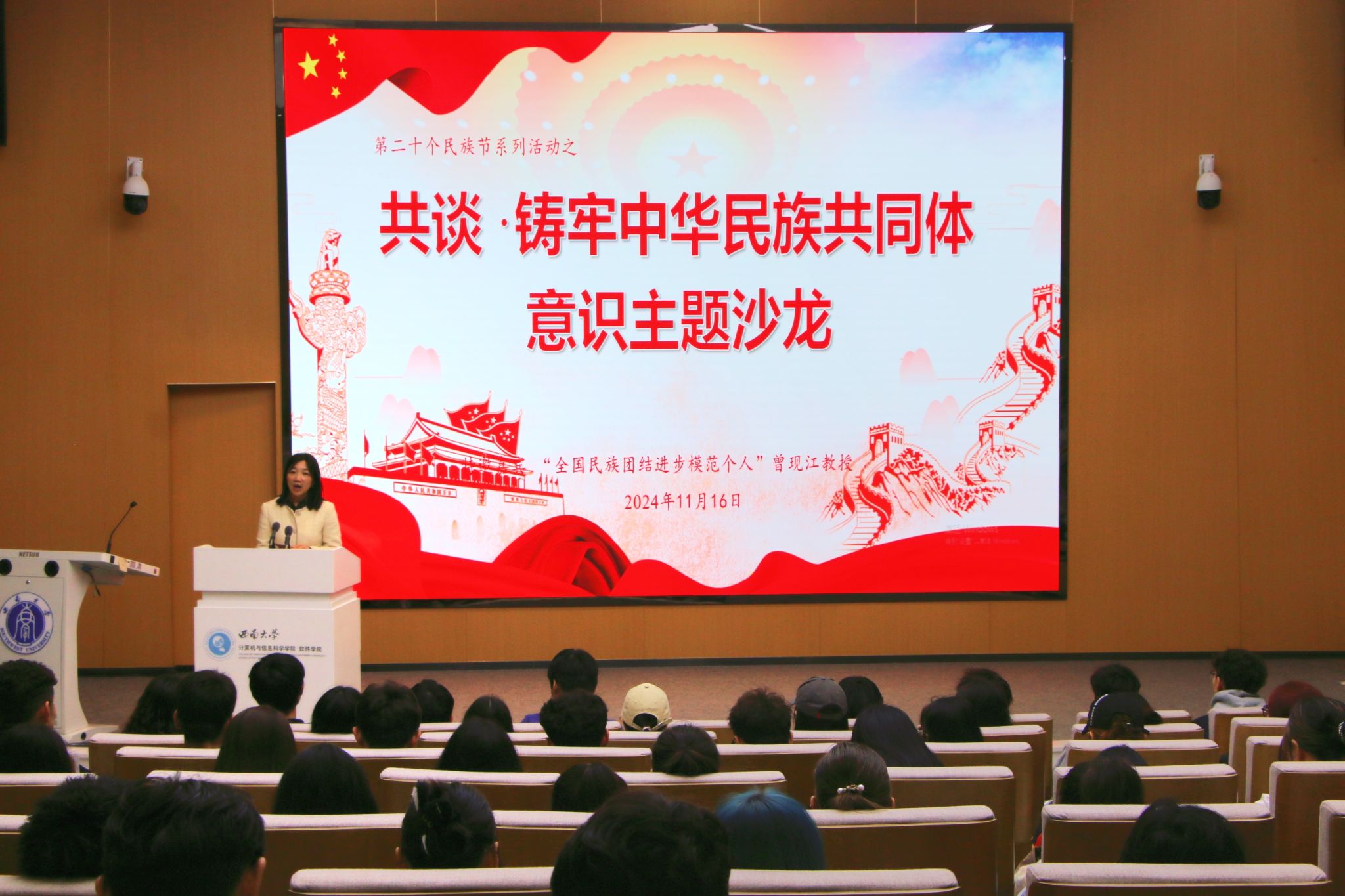 为学习宣传习近平总书记在全国民族团结进步表彰大会上的重要讲话精神,铸牢各族学生中华民族共同体意识,11月16日下午在计算机与信息科学学院一楼学术报告厅,举行了学校第二十个民族节系列活动之铸牢中华民族共同体意识主题沙龙。本次沙龙邀请到“全国民族团结进步模范个人”获得者、历史文化学院教授、博士生导师曾现江教授,与大家分享习近平总书记在全国民族团结进步表彰大会上的重要讲话精神及其民族工作实践心得。沙龙由学生工作部和历史文化学院 民族学院共同承办,历史文化学院党委副书记张静主持沙龙,学工部学生事务管理科科长邱蔚、学生处少数民族专职辅导员萨塔尔和沙来麦提、24级预科辅导员以及红石榴成长社社员、全体2024级预科学生参加。