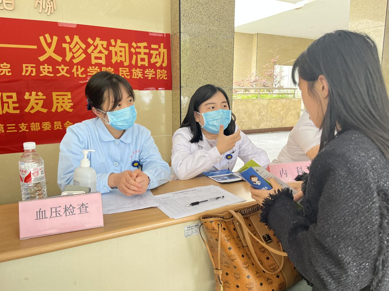 讲座结束后,医务人员为历史文化学院 民族学院师生开展了针对性的义诊活动,现场提供听诊、测血压、用药咨询、科学护肤、医保政策宣传、健康指导等服务。活动现场气氛热烈,师生们纷纷积极参与。医务人员耐心地倾听每个人的健康问题,细致地为大家进行身体检查,提供科学的健康建议,并发放了健康宣教资料。此次活动受到了学院师生的一致好评,希望以后能够在日常保健等方面受到更多的指导和支持。