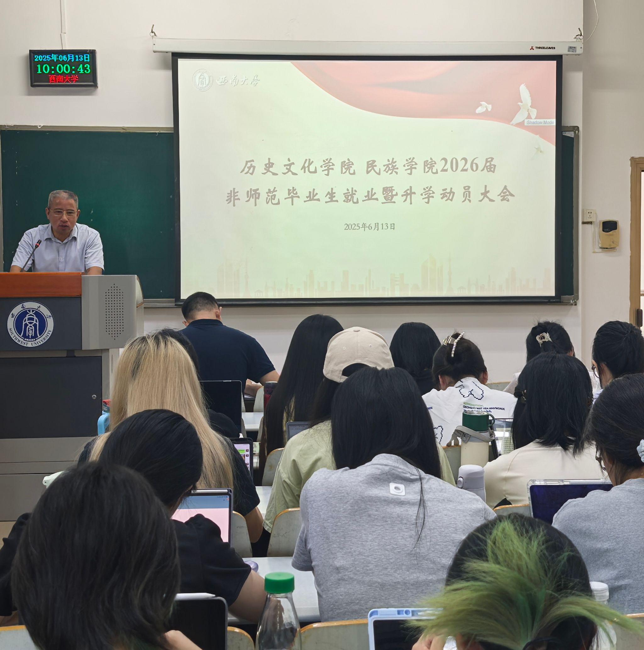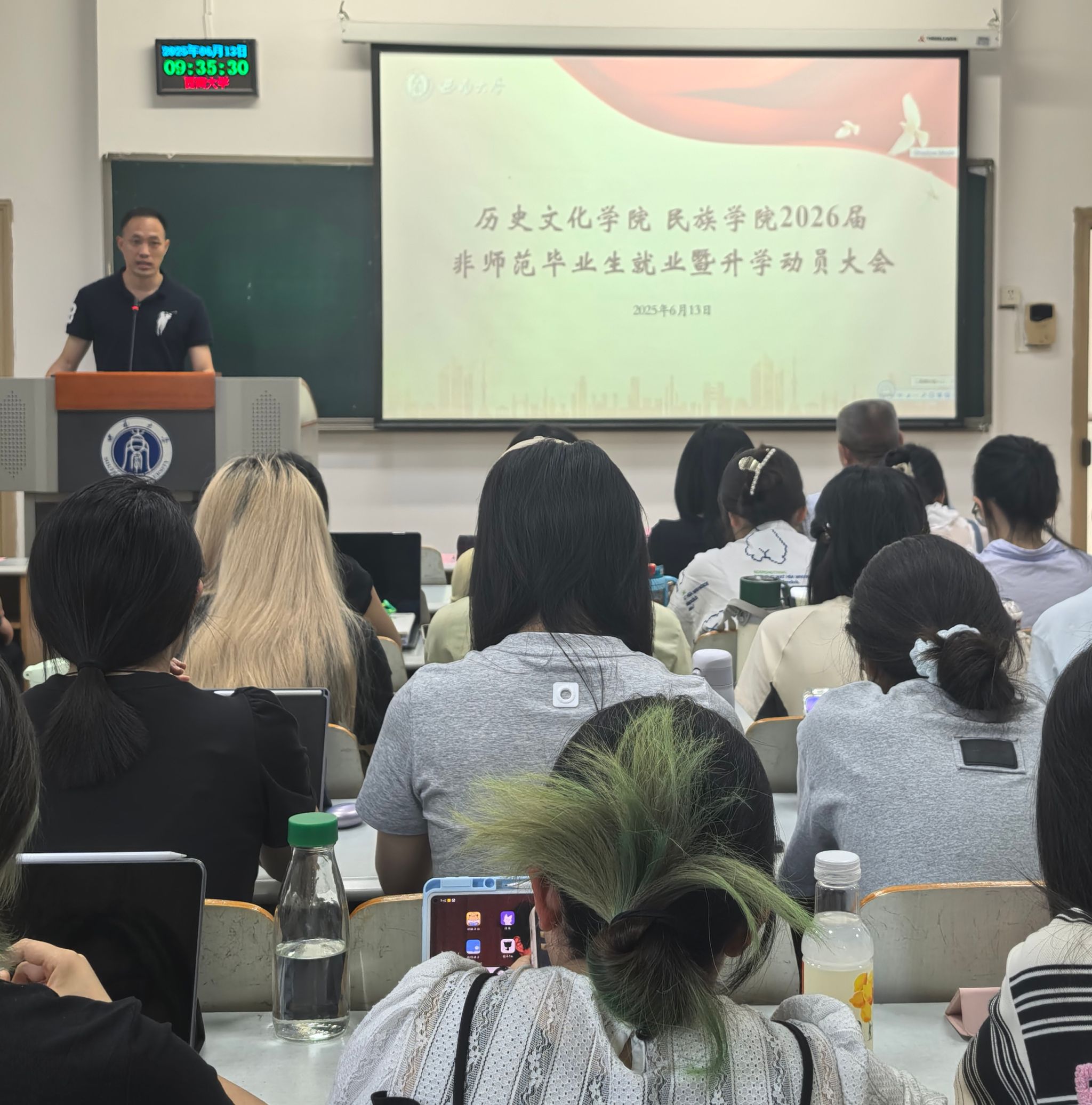 为扎实推进学院2026届毕业生就业工作,引导毕业生明确职业目标,提升就业和考研竞争力,6月13日上午,历史文化学院 民族学院在10教505教室召开2026届非师范毕业生就业暨升学动员大会。学院党委书记罗庆昌、院长赵国壮、党委副书记张静、副院长陈永亮、2022级班主任代表宋亮、2022级辅导员刘玉婷和2026届历史学、民族学专业全体毕业生参加大会。会议由张静副书记主持,分为就业升学动员和升学指导两个阶段。