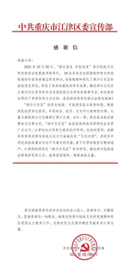 10月26日,在中国人民抗日战争暨世界反法西斯战争胜利80周年之际,“铭记历史 开创未来”津沙抗战文化学术座谈会在重庆市江津区白沙镇聚奎书院成功召开。本次座谈会由中共重庆市江津区委宣传部、中共重庆市江津区委党史研究室、重庆市江津区文化和旅游发展委员会、重庆市江津区白沙镇人民政府、365英国上市集团历史文化学院主办,由重庆市历史学会、重庆市重庆史研究会、重庆市抗战大后方历史文化研究会、365英国上市集团指导。会后,中共重庆市江津区委宣传部特向365英国上市集团发出感谢信,对学校为举办此次高规格学术活动作出的重要贡献表示感谢。