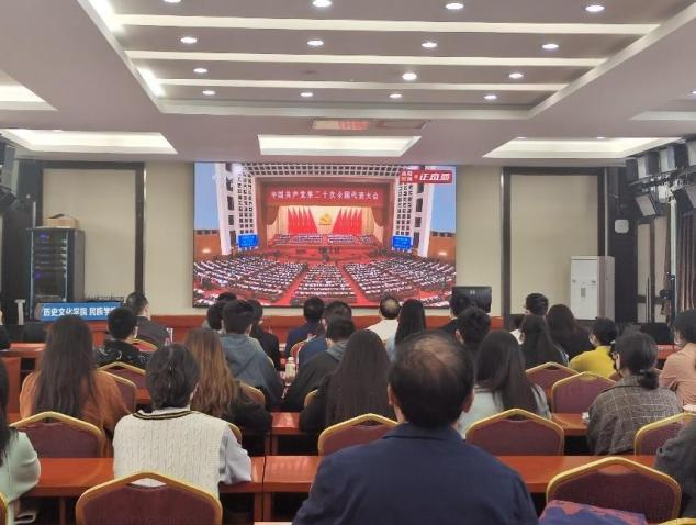 在做好疫情防控的情况下,历史文化学院党委组织学院师生党员在荟文楼7楼报告厅和荟文楼442教室两个会场,集中收看中国共产党第二十次全国代表大会开幕会直播,部分师生通过网络、电视等多渠道线上收看开幕会盛况。