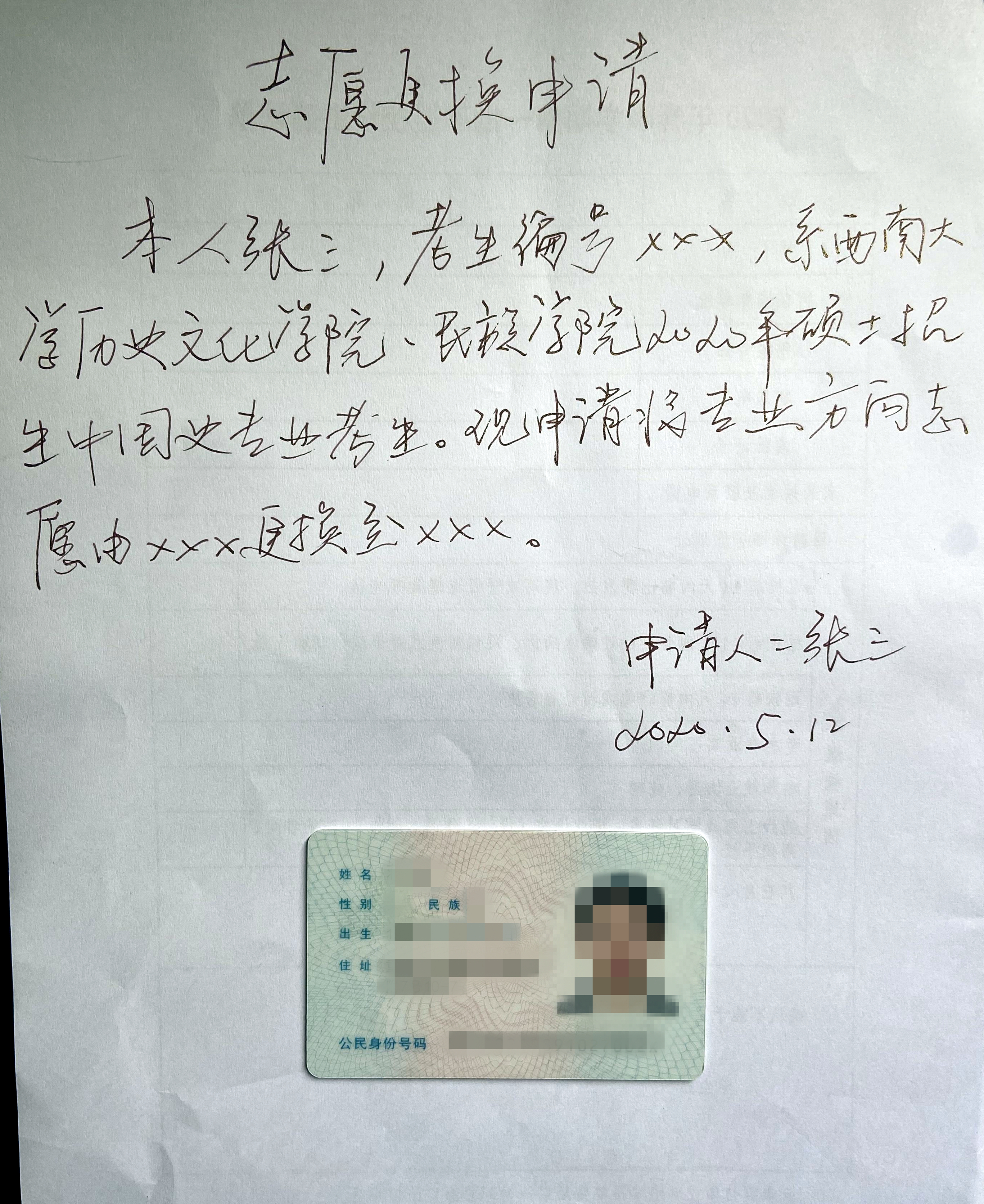 2、请将申请内容手写一份、由本人亲笔手写签名,通过拍照或扫描形式作为附件上传。在拍照或扫描时,请将本人身份证有人像的一面致于申请书空白处;照片或扫描件需清晰可见身份证号、人像等信息。(示例参见附件。)