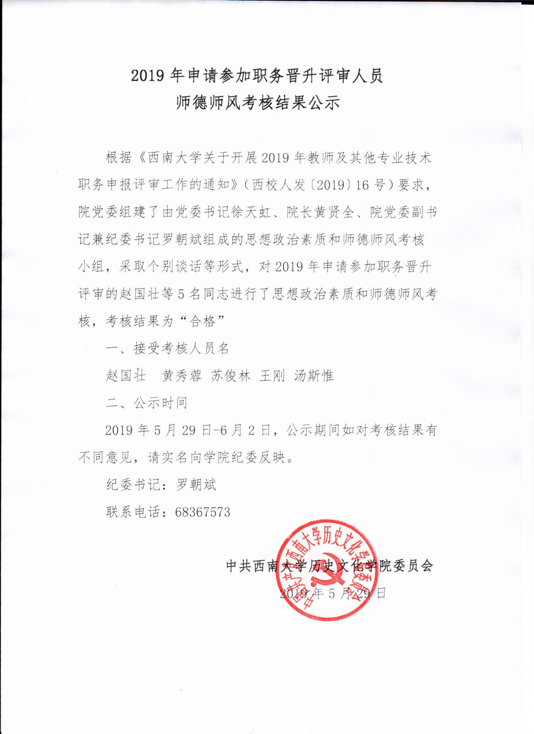 2019年申请参加职务晋升评审人员师德师风考核结果公示