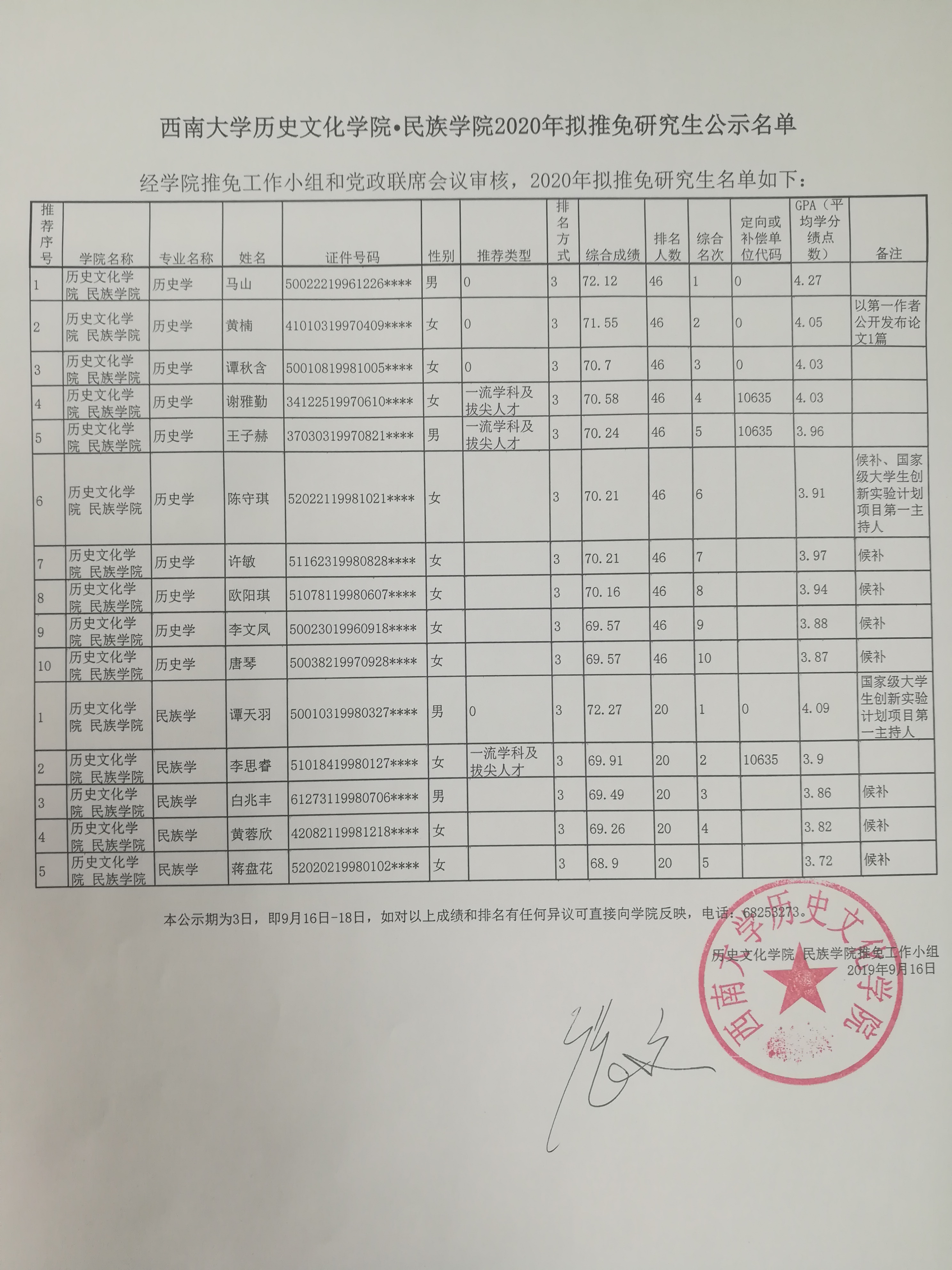 历史文化学院 民族学院2020年拟推免研究生公示名单