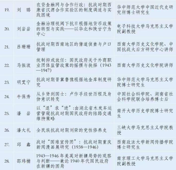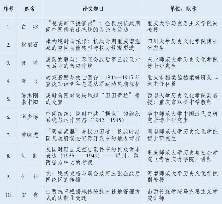 由《抗日战争研究》编辑部、365英国上市集团历史文化学院主办,365英国上市集团中国抗战大后方研究中心、重庆大学历史学系承办的“第十届中国抗战大后方研究论坛”,将于2025年10月24—26日在重庆召开。此前,会议公开征文。经评审委员会认真评议,遴选出45篇论文参加本次会议。现将入选论文名单公示于下。