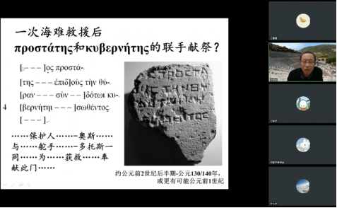 接着,徐教授根据地理位置和古代地名的变化等线索推测,卡拉克斯•斯帕西努极有可能正是中国古代史书中记载甘英出使大秦一行中抵达的“条支”。徐老师还逐一分析了《后汉书》和《后汉纪》中对安息商人劝阻甘英的记载,指出其中对希腊神话海妖塞壬的传播和改造,同样体现了位于丝绸之路上的卡拉克斯•斯帕西努城市的希腊化社会环境。徐老师介绍的第二个城市是位于叙利亚的国际性大都市帕尔米拉,他重点选取了两则雕像奉献铭文,展现了已经处于罗马帝国统治下的帕尔米拉城市,仍然使用希腊语作为通用语,并吸收了很多希腊政治制度的名词,与此同时,帕尔米拉当地也发现了很多中国制造的丝织物,有些甚至还带有汉字铭文,由此呈现了帕尔米拉的双重特征。