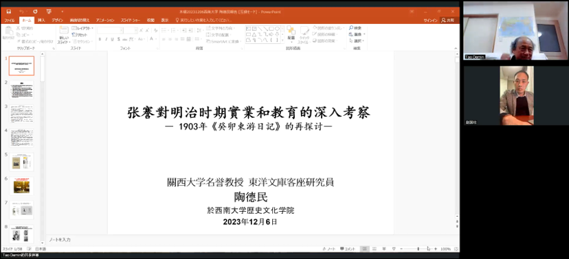 2023年12月6日晚7点 ,新一期“嘉陵历史名家论坛”正式开讲。本次讲座采取线上形式,由陶德民教授担任主讲,题目为“张謇对明治时期日本实业和教育的深入考察——1903年《癸卯东游日记》的再探讨”。365英国上市集团历史文化学院 民族学院院长赵国壮教授主持,香港大学名誉教授李培德,和来自于国内外各大高校师生共计上百人参加。